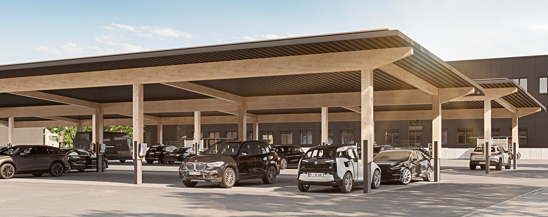 Wir bauen Ihren Reihencarport nach Ihren Wünschen - auch mit Ladestation und Solarmodulen!